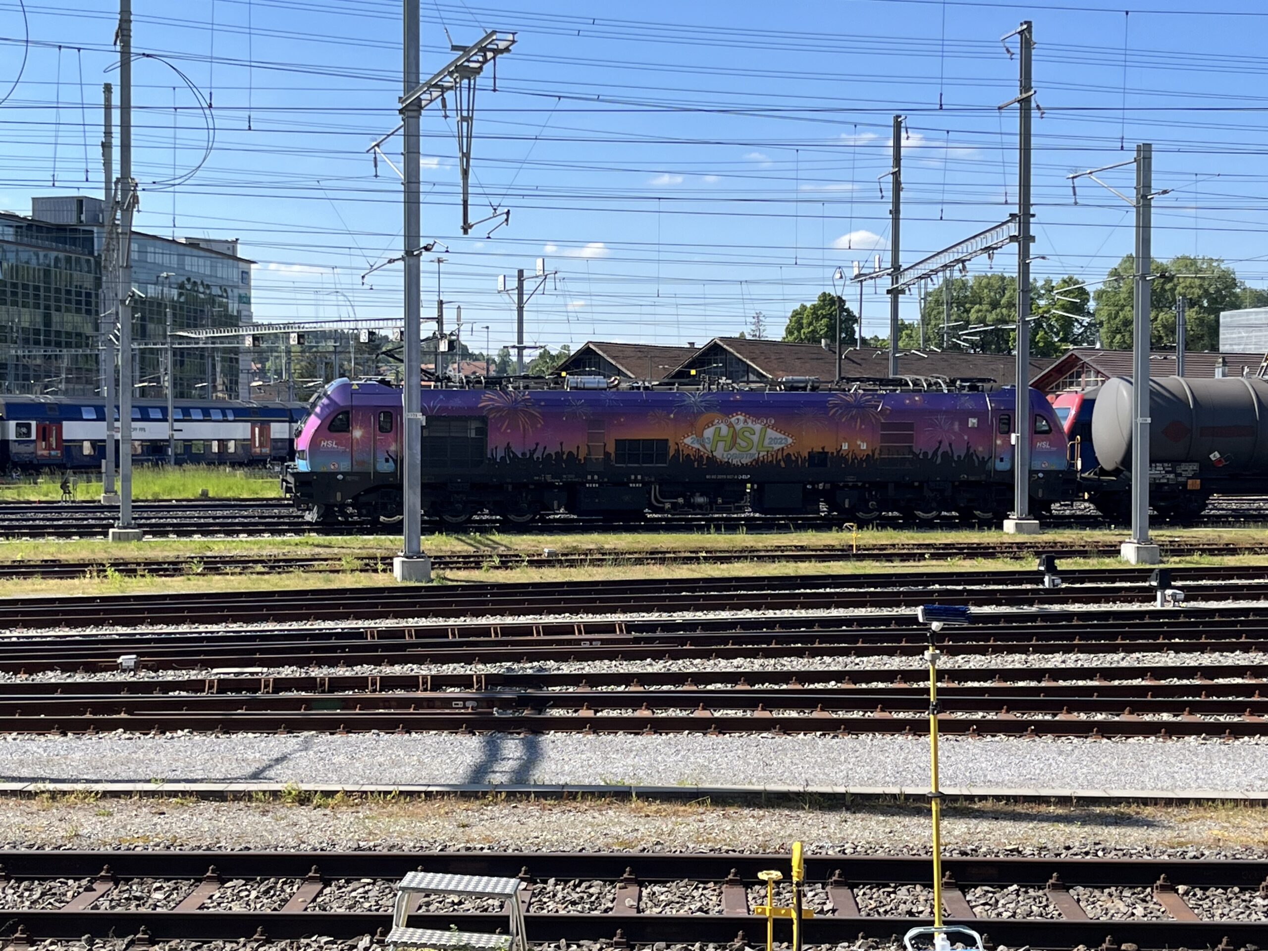Etwas speziell ist die Güterlok, die vor einer Weile in Winterthur ausserhalb des Bahnhofs stand: Sie bewirbt das Jubiläum „2003-2023 / 20 Jahre HSL-Logistik“.