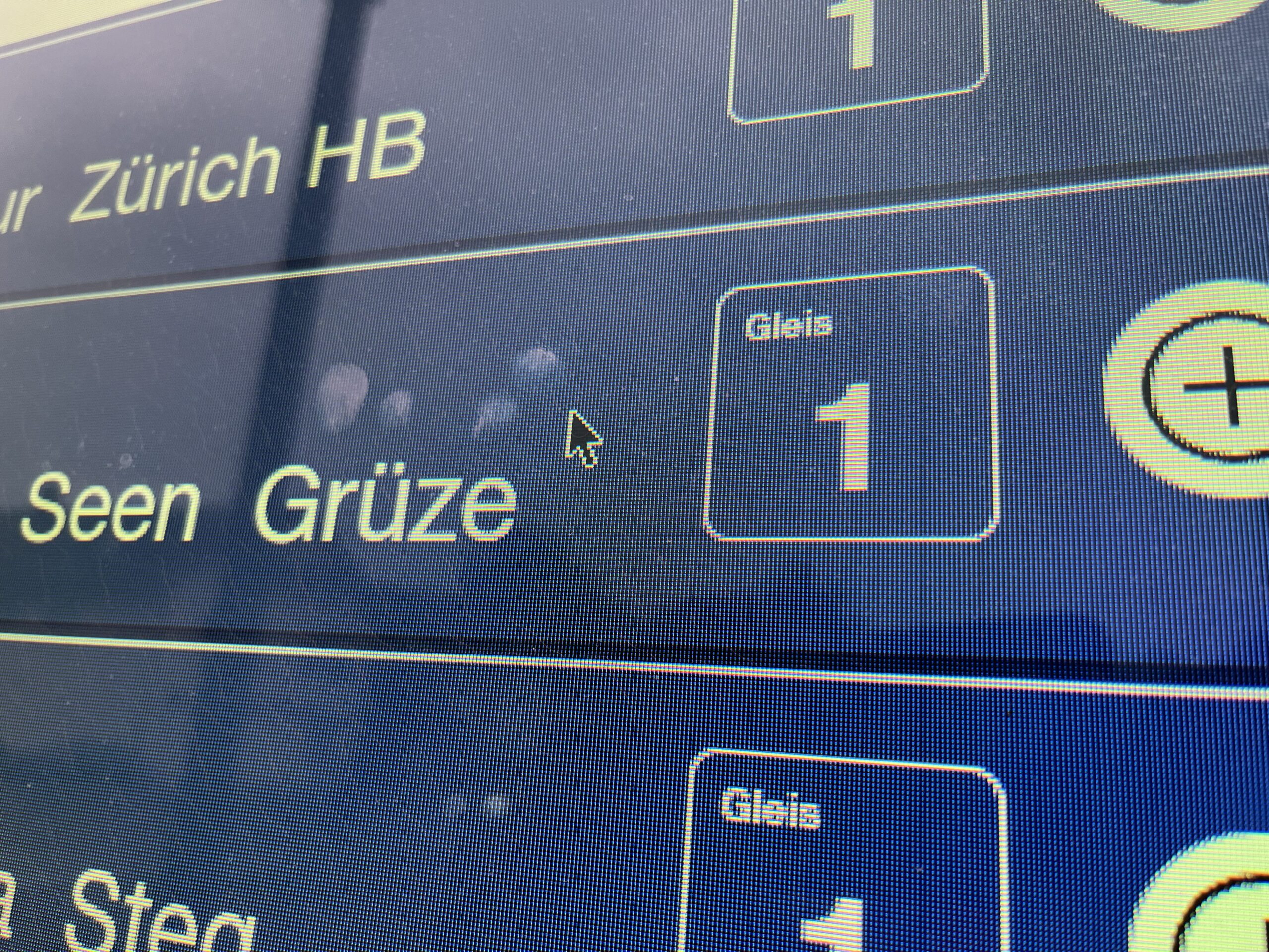 Auf dem grossen Bildschirm bei uns am Bahnhof werden Abfahrtszeiten, Zugsdestinationen und -verspätungen angezeigt. Dazu auch das jeweilige Gleis. Wobei dieses – das Gleis – jeweils nicht schwierig zu erraten ist: Es gibt bei uns ja nur eines.