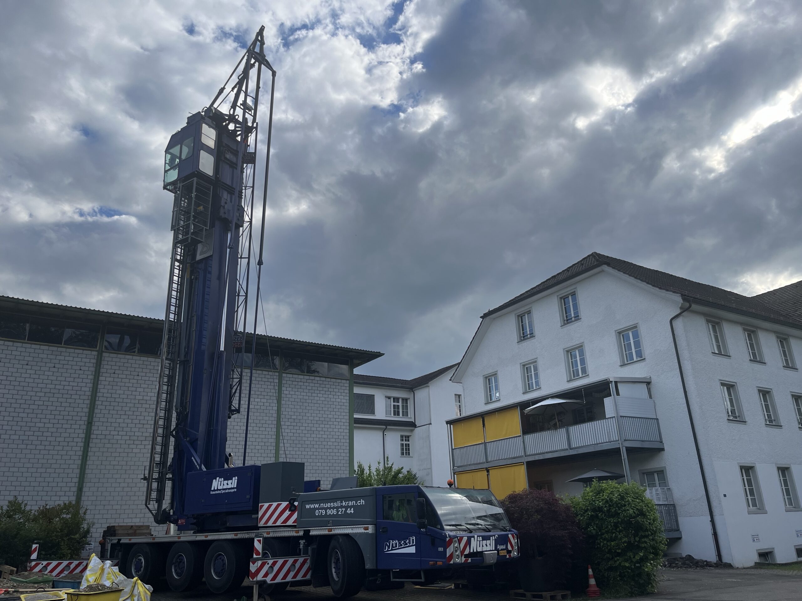 Offenbar muss dafür unterschiedlicher Aufwand betrieben werden: Während bei den meisten Häusern eine Schubkarre und eine Schaufel oder allenfalls ein kleiner Bagger ausreicht, muss für die Dachterrasse eines Hauses auf meinem Weg zum Bahnhof – wahrscheinlich hinten, bei den Tösslofts – gröberes Geschütz aufgefahren werden: Neben der Strasse steht ein grosser Kranwagen, mit dem laut der Tafel, die Anfang Woche dort stand, Material zu- und abgeführt wird. Über ein Hausdach hinweg. Ungefähr 50 Meter Luftlinie.