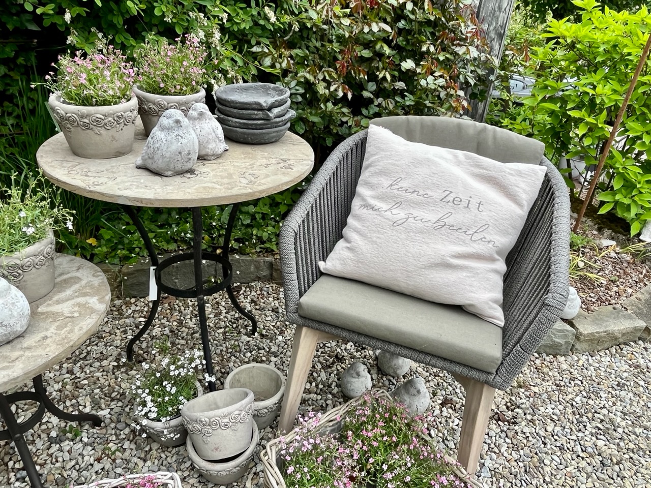 Also, das Objekt der Begierde war das „Gartenfenster“. Nach eigener Beschreibung – ich hätte es nicht besser formulieren können – handelt es sich dabei um eine Wohn- und Gartenboutique. Einfach formuliert hat da ein Ehepaar zwei grosse Wohnhäuser samt Umschwung gemietet, die Räume minimal-invasiv zu Ausstellungsräumen umgestaltet, alles sehr stilvoll eingerichtet, den Garten mit Buchsbaumkugeln, Lavendel, tiefen Hecken und grösseren Pflanzen sowie mit liebevoll angelegten Kieswegen und -plätzen und diversen Lounges arrangiert. Zu kaufen gibt da es alles, was das Boutique-Besucher-Herz begehrt: Von Lavendel über Eukalyptus bis zu Hortensien, Flüssigseife und Kerzen in allen Duftrichtungen, Lederwaren für alle Altersstufen und Geschlechter, Kleidungsstücke, Textilien, Geschirr, Gefässe in jeder Form und Art und Grösse, Gewürze, Deko-Elemente, Möbel, Karten und andere Papeterieartikel sowie noch viele weitere Dinge – grössere und kleinere, die mir schon gar nicht mehr alle einfallen wollen. Wunderschön, aber viel zu viel für mich, um den Überblick zu behalten. Ein zweiter oder dritter Besuch dort könnte dem wohl entgegenwirken.