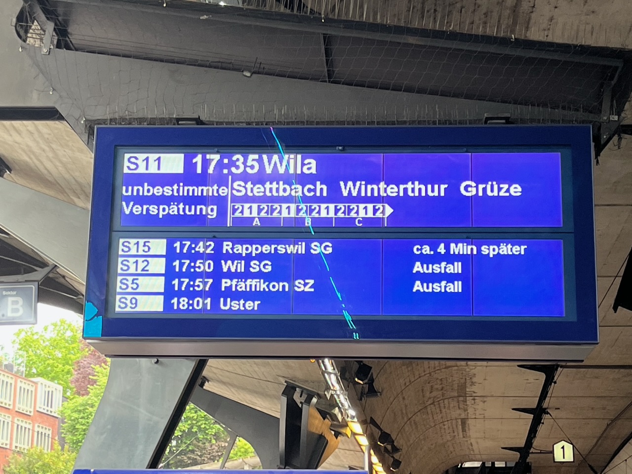 Verspätet jedoch war die S11: Zuerst 3, dann 4, 5, 6 Minuten und irgendwann unbestimmt. Der Grund waren Personen in Gleisnähe zwischen Altstetten und Hardbrücke. Deswegen stand der Zug irgendwo da.