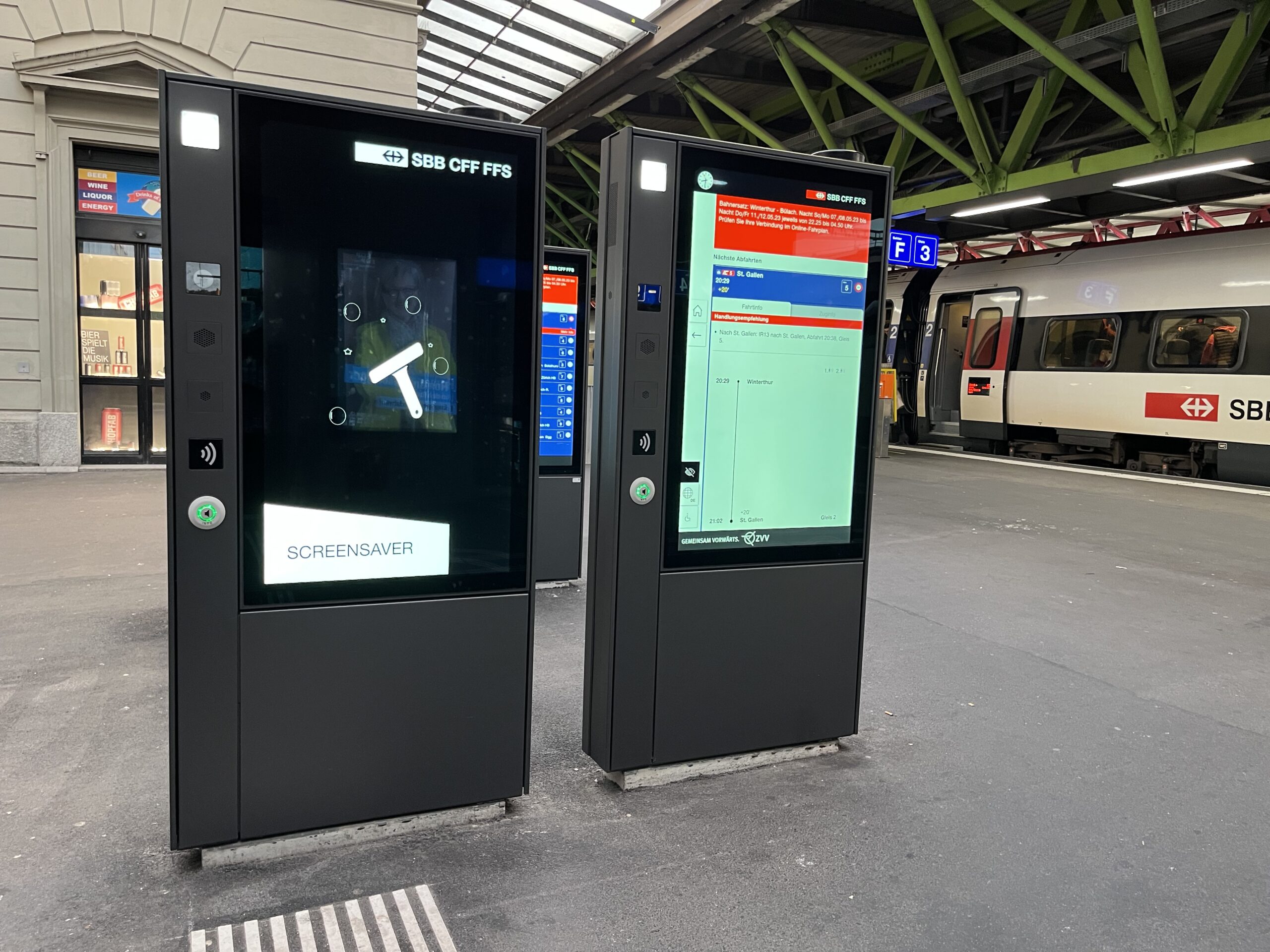 Als wir gestern Abend in Winterthur am Hauptbahnhof an den interaktiven Anzeigescreens vorbeikamen, war einer davon schwarz. Nicht ganz schwarz, nein: Der Schriftzug „Screensaver“ war unten links schwarz auf weiss zu lesen, während ein stilisierter Fensterschaber die quasi scheinbar von innen her „eingeseifte“ Scheibe feucht abwischte.