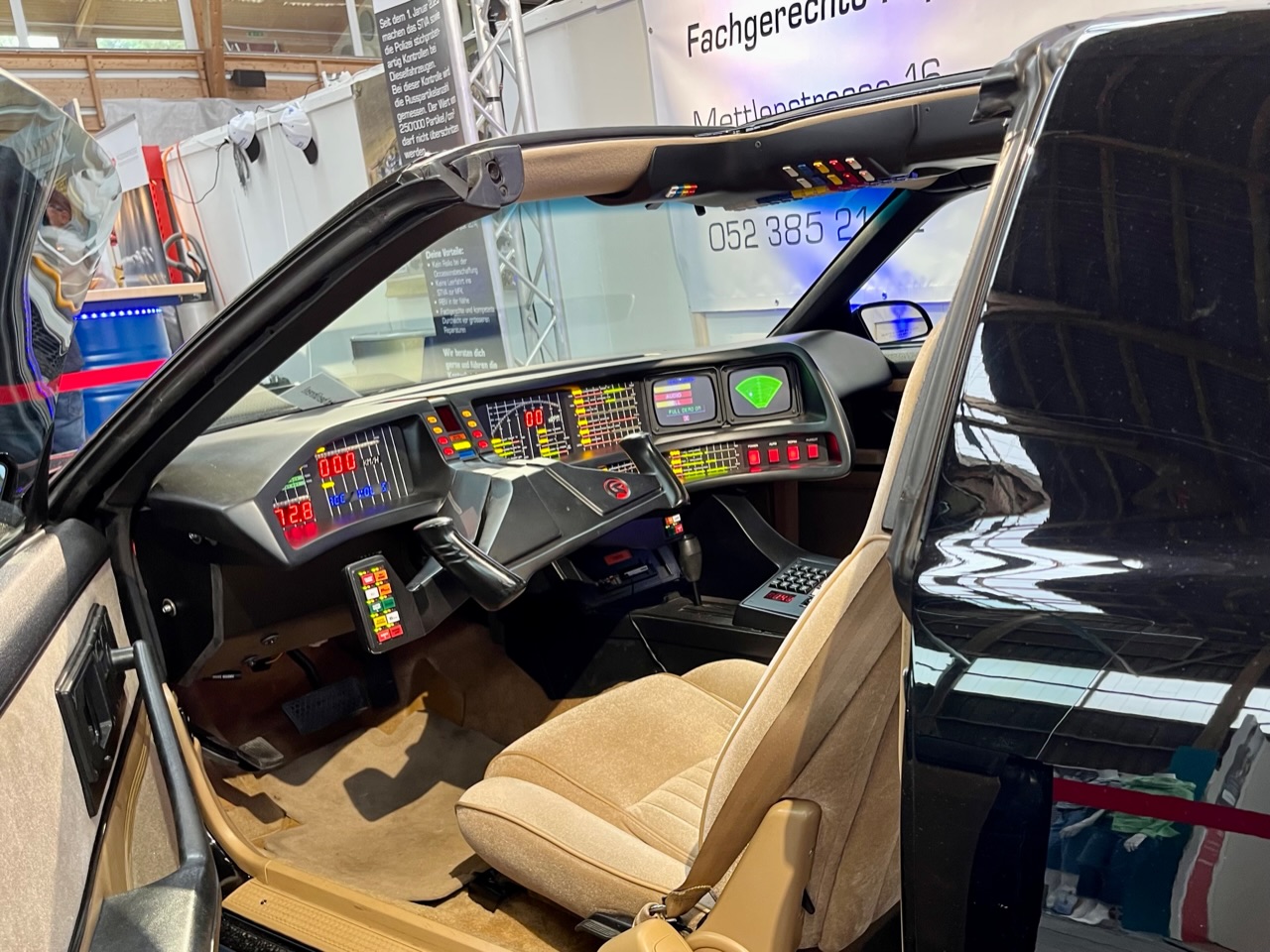 Nun jedoch stand genau dieses Auto in unserem Nachbardorf an der Gewerbeausstellung: Das rote Lichterband an der Front des schwarzen Trans Am bewegte sich hin und her, das Cockpit erstrahlte in seinem Achtzigerjahre-Chic mit beigem Polster, schwarzem Kunststoff und vielen mechanischen Knöpfen und Tasten.