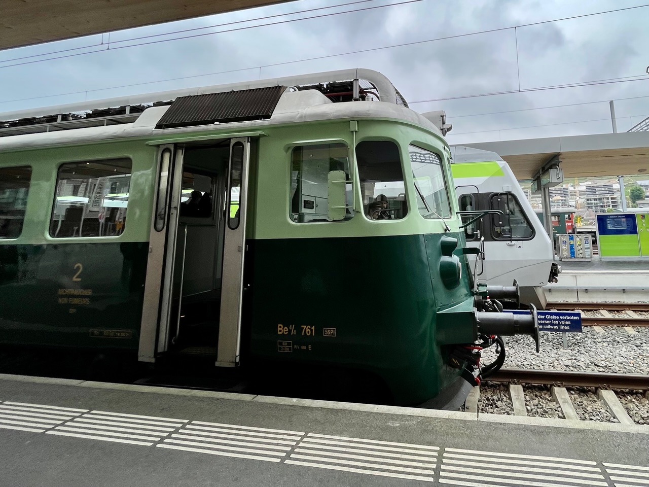 Als dieser Zug eingeführt wurde, war der daneben stehende Triebwagen jedoch schon knapp 40 Jahre alt: Dieser – eine BE 545 von 1953 – hört auf den klingenden Namen „Wellensittich“ und war am Samstag offenbar durch eine Gruppe gechartert worden, die damit einen Ausflug unternahm.