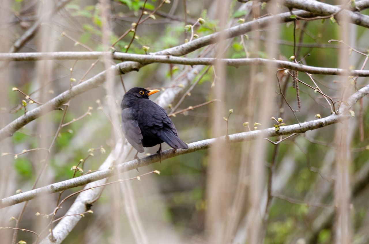 Am Karfreitag – ich habe darüber geschrieben – war es der Kormoran. Vor einer Woche hockte ein Amselmännchen geduldig etwa 10 Meter von mir entfernt in einem Busch und wartete, bis ich mit Fotografieren fertig war. In seiner Schlichtheit doch ein schöner Vogel! Vorgestern mussten Bilder vom Waldboden und dem Ufer des Weihers reichen, denn Vögel wollten sich im Nieselregen keine zeigen – oder flatterten weit weg von Ast zu Ast. Eine Frage sei angesichts des erwähnten leichten Regens erlaubt: