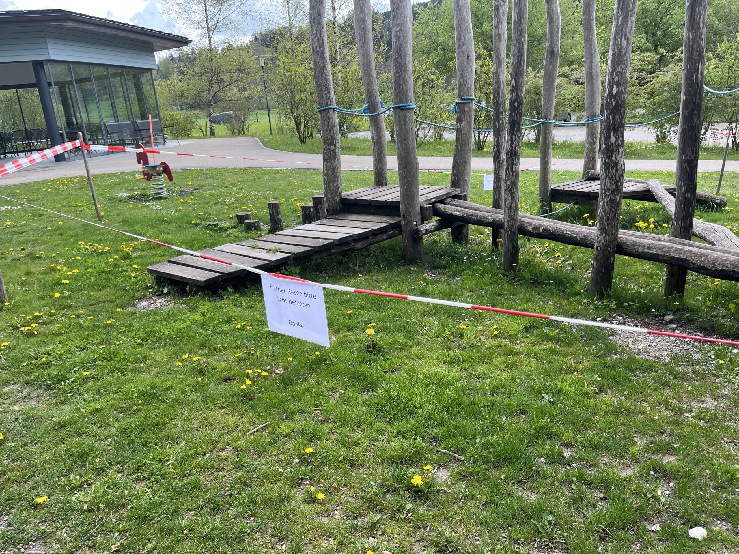 „Frischer Rasen bitte nicht betreten / Danke“ stand auf dem A4-Blatt, das an einem Absperrband hing. Dieses wiederum war um den Spielplatz bei uns auf dem Gelände gespannt.