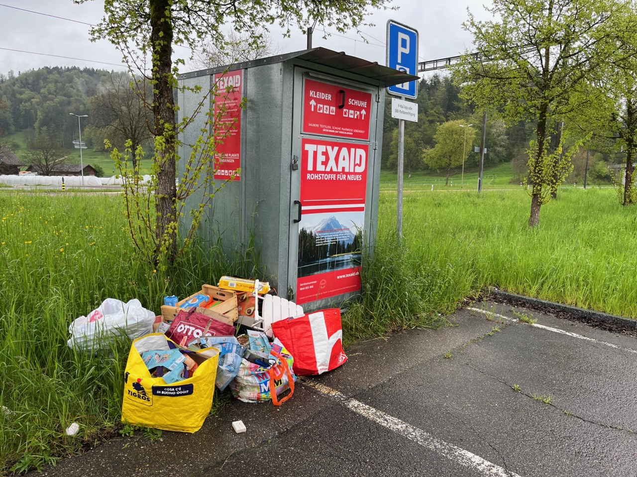 Die Definition von Littering ist laut Duden „das ungeordnete Wegwerfen von Verpackungen ohne vorheriges Sortieren“. Dieser Definition entsprach das, was letzthin neben der Kleidersammelstelle anzutreffen war, ziemlich exakt: Säckeweise Hygieneartikel- und Lebensmittel-Verpackungen, von Feuchttüchern über Babybisquits bis hin zu Arborio-Reis.