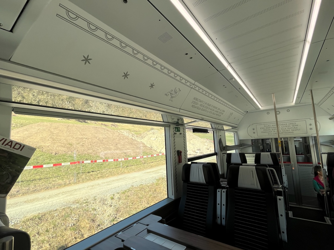 Ein Highlight konnten wir mangels Klassenwechsel leider nicht geniessen: Das Erstklassabteil ist zu einem „Stübli“ im Engadiner Stil in Grautönen mit stilvollen Sgrafitti umgebaut worden. Ich konnte deshalb nur von der Tür her kurz reinschauen.