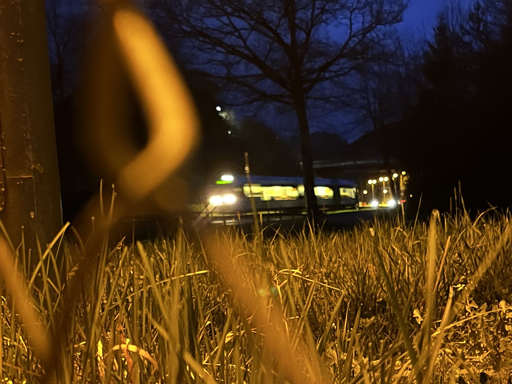 Heute wartete ich vor der Unterführung, um die S26 fotografieren zu können: Fokus und Belichtung einigermassen eingestellt (bei einem iPhone etwas mit Hoffen und Rätseln verbunden), dann abwarten – im vollen Bewusstsein, dass die gelblich scheinende Strassenlaterne, das hohe Gras, der Maschendrahtzaun und die Bewegungsunschärfe des fahrenden Zuges eine spezielle Bildkomposition ergäben.