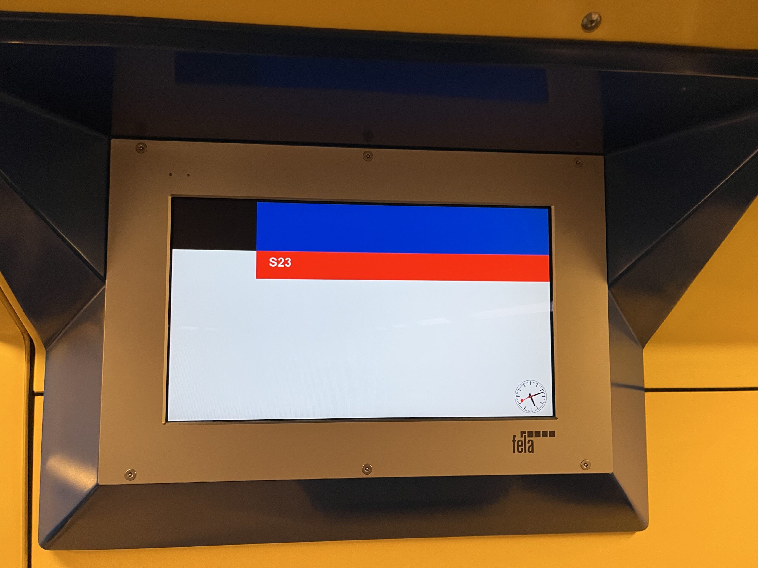 Alles? Nein. Zwar zeigte das Display die richtige Zeit an (17:12) und beantwortete auch die Frage nach dem Namen des Zuges (S23). Das Ganze in blau/rot/weiss, in bester 1.-Generation-S-Bahn-Manier. (Bis eben war mir nichr aufgefallen, dass diese sich von der Anzeige in der S11 unterscheidet.)