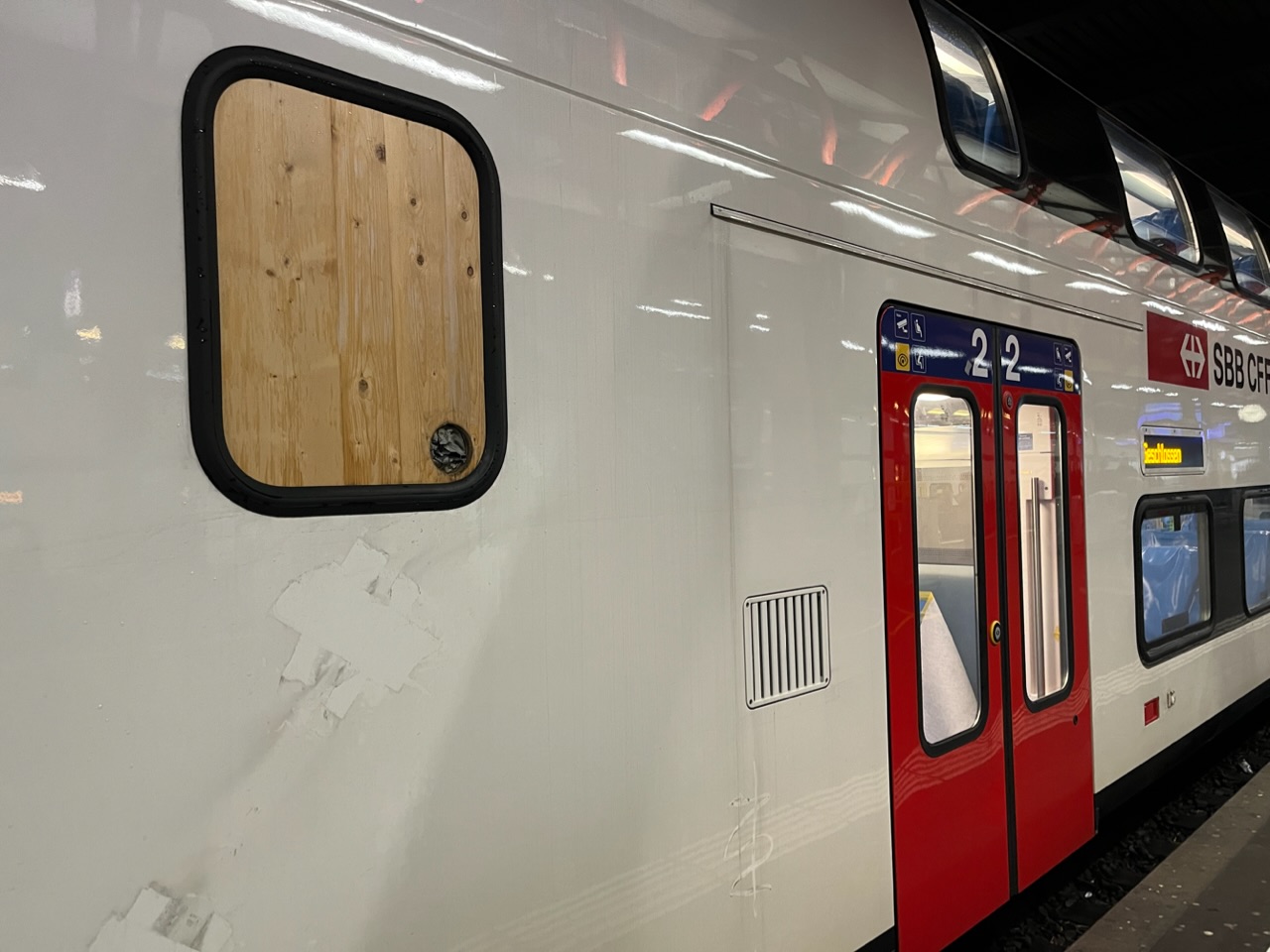 Auffällig war jedoch: Einzelne Fenster bei diesem Zug bestehen nicht aus Glas oder zumindest aus einem durchsichtigen Polymer, sondern aus einer soliden Holzplatte. Es ist auch ein bisschen irritierend: Ist das Kunst am Zug (wie Kunst am Bau)? Wollen die SBB ihr ökologisches Engagement zur Schau stellen?