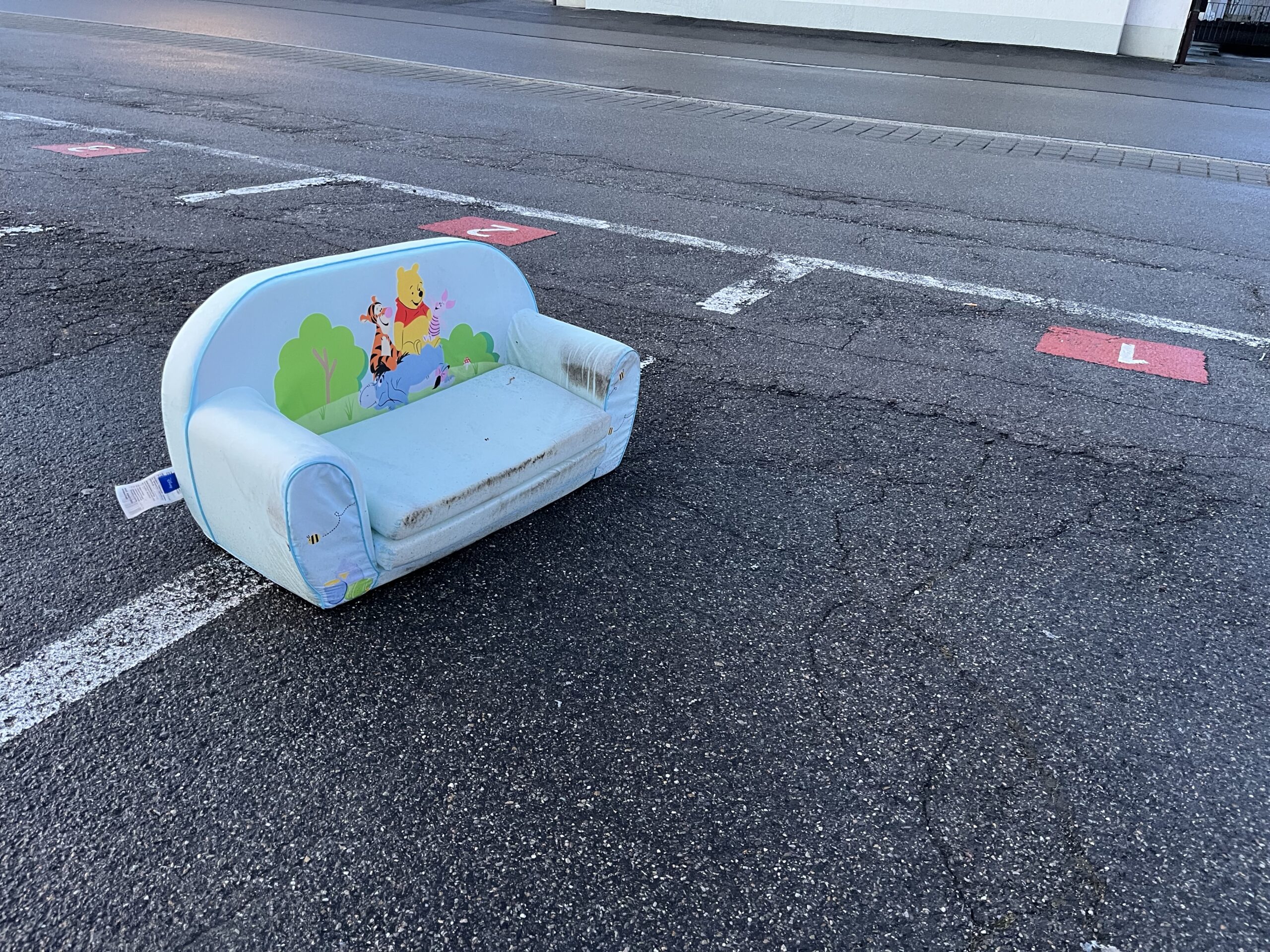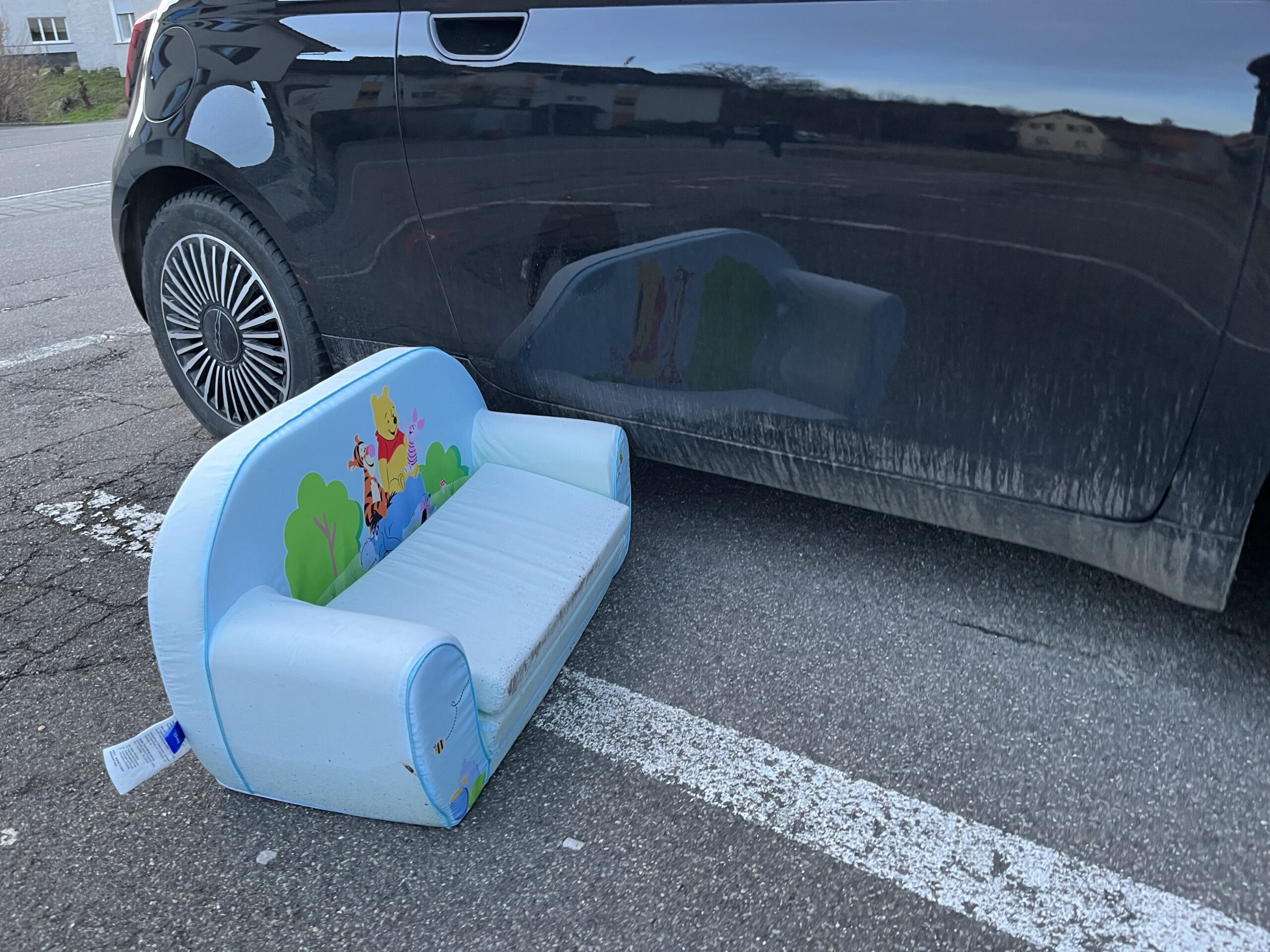 Nachdem das Spielsofa lange neben der Texaid-Sammelstelle gelegen hatte und in der Nacht auf gestern vom Sturmwind zum schwarzen Fiat 500 geblasen worden war, lag es heute ganz verloren auf dem Parkplatz rum.