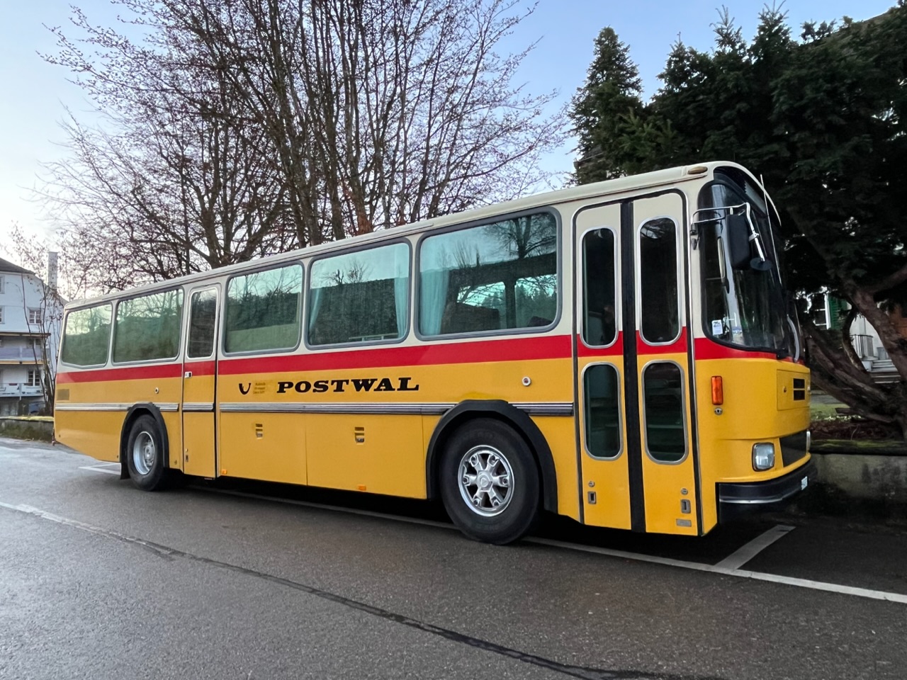 So, genau so, sahen früher die Postautos aus. Der grosse Bus, an dem ich momentan jeden Tag auf meinem Weg zum Bahnhof vorbeikomme, trägt immer noch seine ursprüngliche gelb-weisse Lackierung mit dem breiten roten Streifen unterhalb der Fenster. Auch das Schild auf dem Rückfenster, mit dem darum gebeten wird, man möge den Bus nach einer Haltestelle sich wieder in den Verkehr eingliedern lassen, wenn er blinke, ist noch da. „Grazie“ steht darauf. Das Postauto hat also früher in der italienischsprachigen Schweiz verkehrt.
