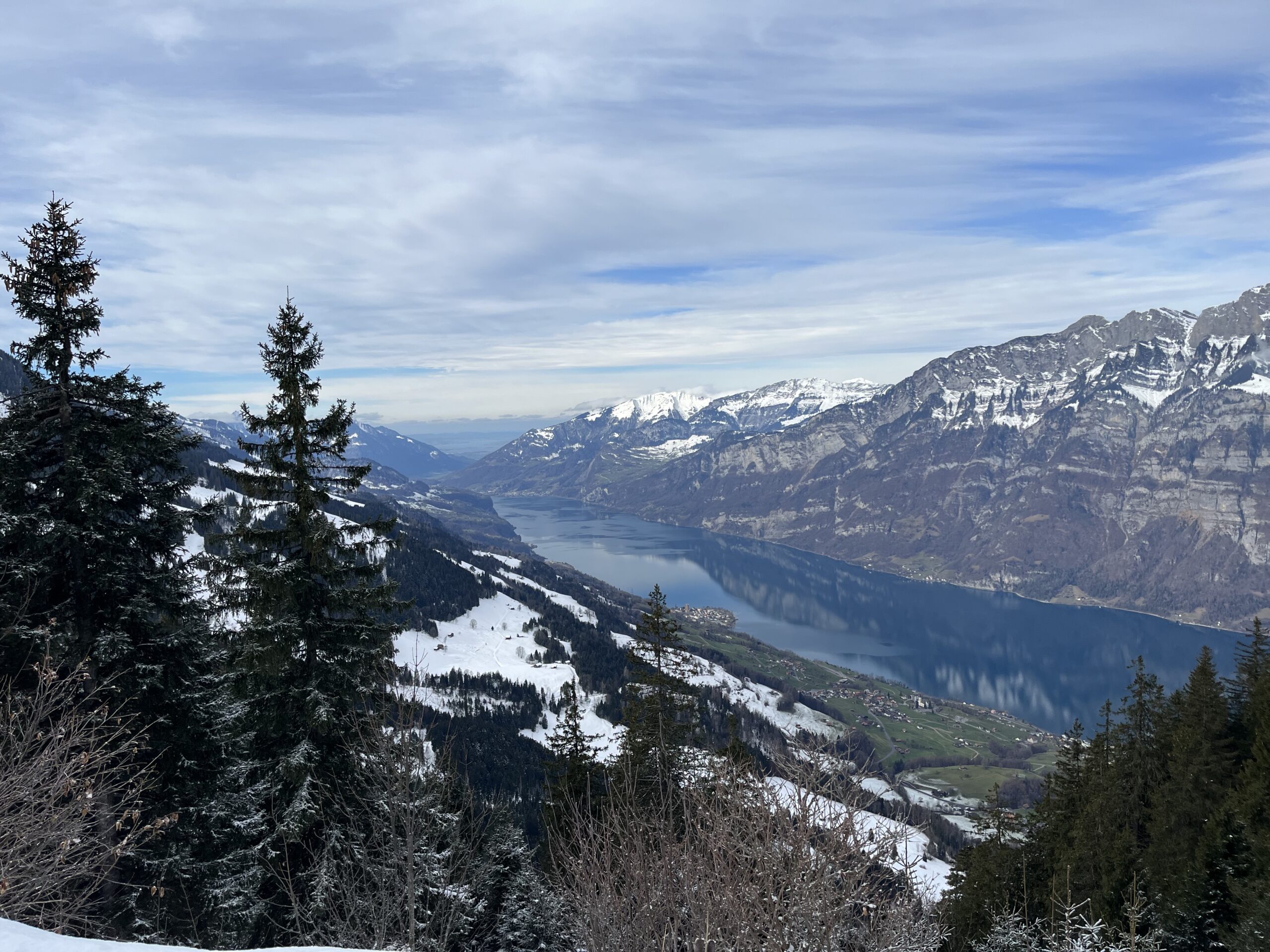 An einem der meines Erachtens schönsten Ausblicke überhaupt kommt man nur zu Fuss oder mit Schneeschuhen vorbei: Ohne irgendwelche störenden Bahnen oder übervölkerten Skipisten im Vordergrund sieht man den Walensee, der rechts durch die Churfirsten flankiert wird, und dahinter, ennet der Linthebene, den Ober- und den Zürichsee.