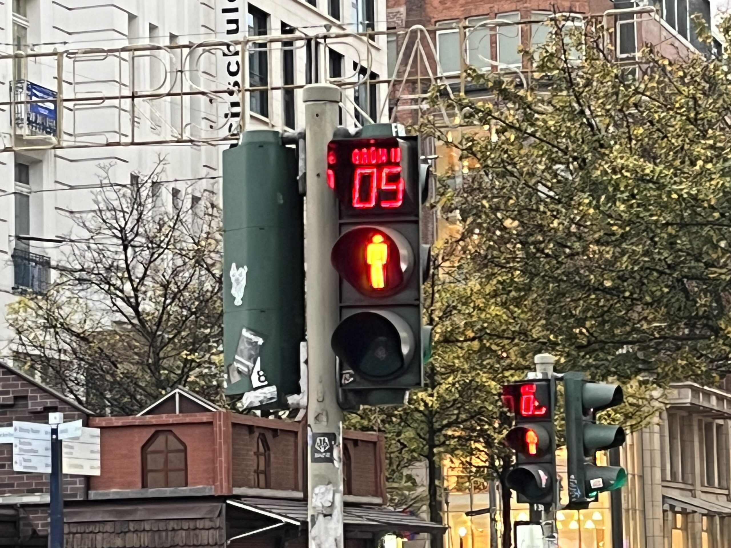 In Hamburg findet man verschiedene Ampeln für Fussgänger – nur die schweizerische Ausführung mit „Grün – Orange – Rot“ nicht. Stattdessen habe ich Lichtsignale gesehen, die ein grünes und zwei rote Lichter hatten – weshalb auch immer. Üblich ist dort jedoch die Ampel mit einmal grün unten und einmal rot oben. Bei solchen Ampeln gerate ich jeweils latent in Stress, da ich bei Grün nie weiss, ob es sich lohnt, noch zwei oder fünf Meter zu rennen und die Strasse…