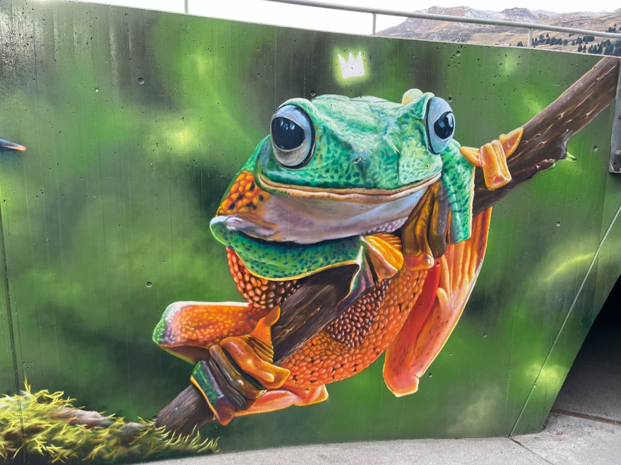 Es ist eine der schönsten Fussgängerunterführungen, die ich schon gesehen habe: Jene bei der Talstation der Rothornbahn auf (oder sagt man „an“?) der Lenzerheide. Vor allem der Aufgang zur Bahn gefällt mir sehr. Er ist sehr kunstvoll und lebensnah bemalt mit einem Eisvogel und einem Frosch (und noch etwas: Heidi? Keine Ahnung mehr). Es beeindruckt mich sehr, dass die Malereien in keiner Art und Weise verschmiert worden, sondern so belassen worden sind, wie der Künstler sie wollte. Das Einzige nicht…