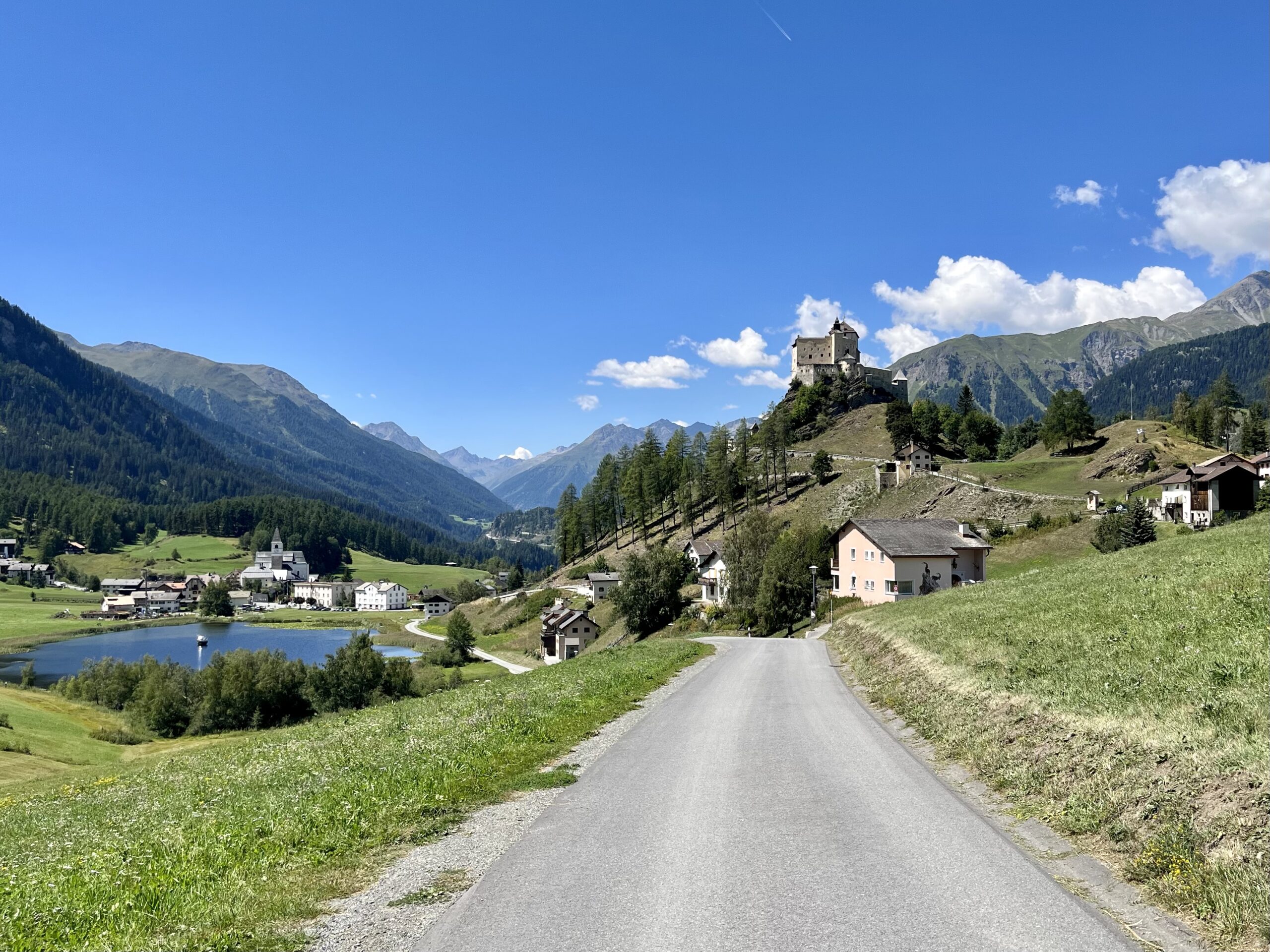 Von Sent aus auf der selben Höhe auf der Strasse weiterfahrend, verengt sich diese zusehends und führt in ein enges Tal hinein. Ein Kreuzen ist nur noch an wenigen Stellen möglich. Und doch fährt da regelmässig, mehrmals täglich, ein Postauto durch. Am Ende der Strasse tut sich das Val Sinestra auf, mit einem riesigen Hotel, das irgendwann Anfang letztes Jahrhundert gebaut worden ist. Im Sommer und im Winter, jeweils zur Hochsaison, – aber das tut hier nichts zur Sache –…