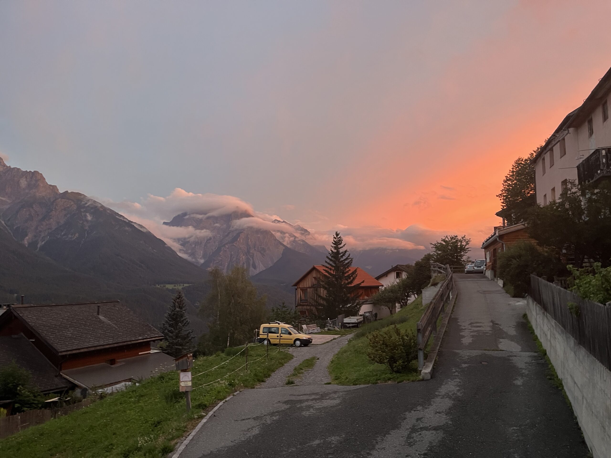 Die Sonne geht von Sent aus gesehen jeweils gegen das Oberengadin hin unter. Sonnenuntergänge sieht man von unserer Ferienwohnung her nicht direkt, aber man sieht, wie die letzten Sonnenstrahlen noch die Unterengadiner Berge beleuchten, bevor sie langsam erlöschen. Bei Abendrot sind ebenfalls die Auswirkungen zu sehen: Zum Beispiel die in allen Farben leuchtenden Schönwetterwolken. Eines Abends war es in den Sommerferien tatsächlich wieder mal so, dass ein besonders intensives Abendrot glühte. Ich konnte nicht umhin und fotografierte das Naturphänomen in…