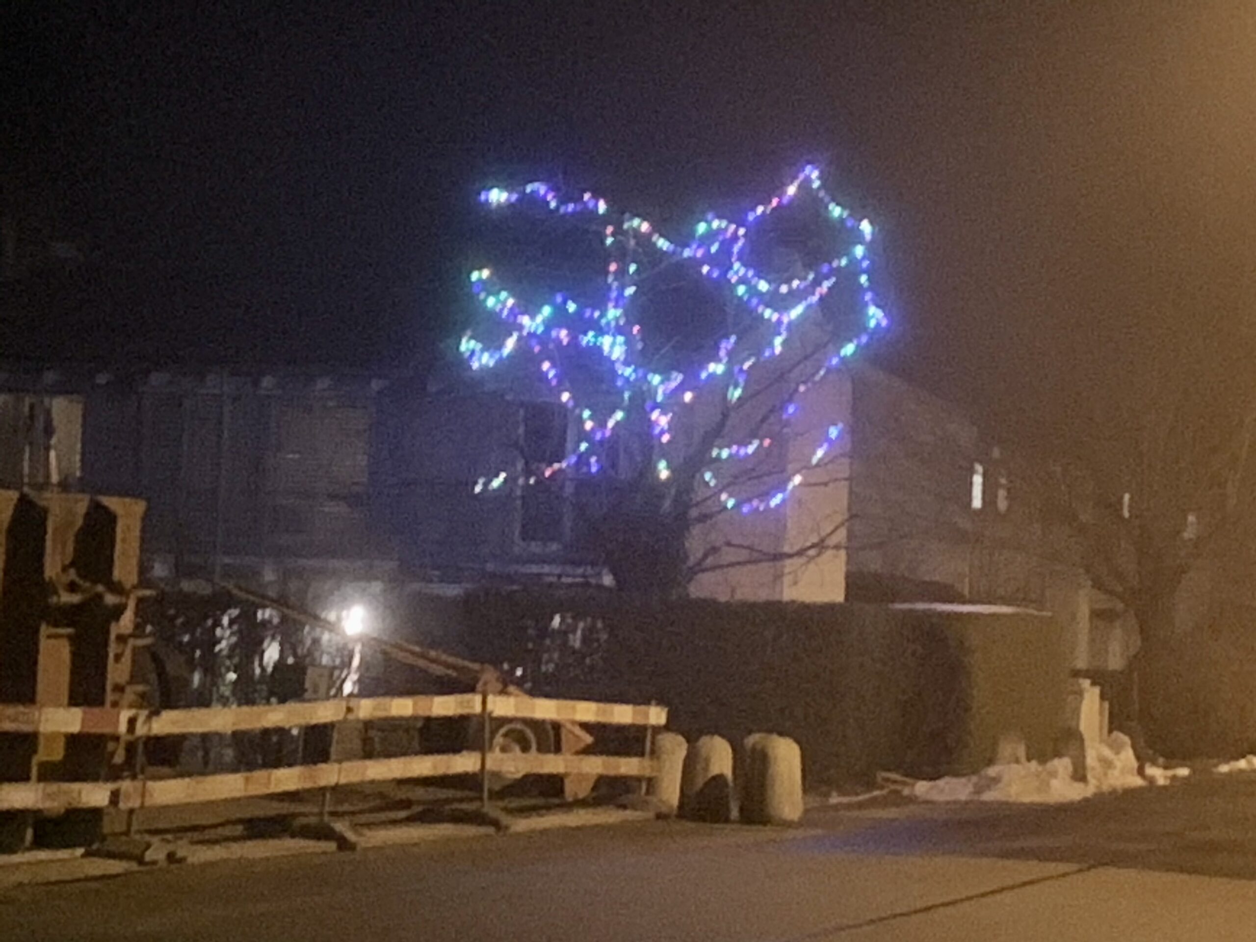 Nebst all dem mehr oder weniger klassischen Weihnachtsschmuck in warmen Weisstönen stechen „Exoten“ besonders heraus: Blinkende, kaltweisse, wie Wassertropfen animierte oder – immer wieder „hübsch“ – farbige Lämpchen und Girlanden. Auf meinem Weg zum Bahnhof begegne ich einem Baum, der neuerdings allen Ästen nach eine farbige Girlande trägt. Sein winterliches Skelett erscheint nun bizarr in rot, gelb, grün und blau. Sehr speziell! Wenigstens blinkt der Baum nicht auch noch …